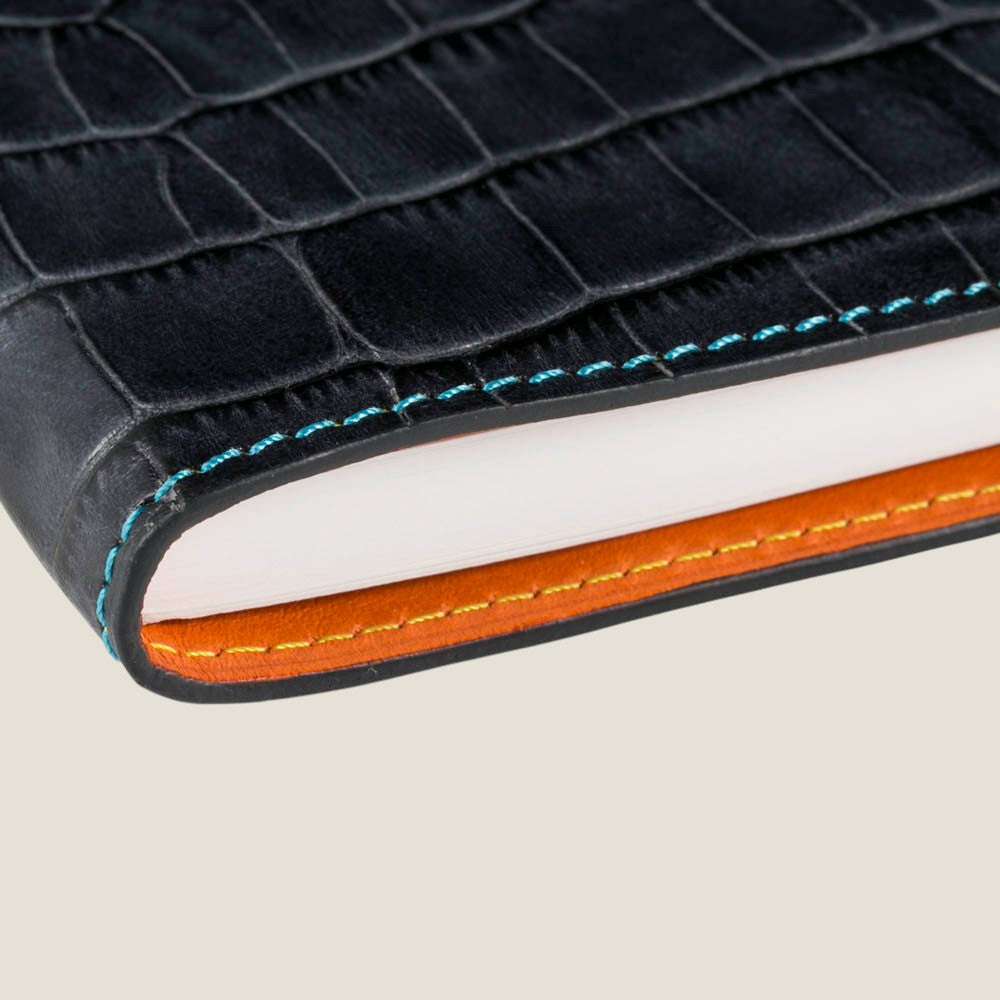 生後1年強のキップレザー(牛革)に、スモールクロコダイルの型押しを施したレザー。リアルクロコダイルに近い風合いを表現するため、ただ単に表から型を押すのではなく、表裏同時に別の型を押すことで、より凸凹の陰影が表れています。さらに、染色時もセミアニリン(染料と顔料をうまく調合する)仕上げを施すことで、透明感のあるカラーとなり、光の反射で凸凹の濃淡が美しく見えるのです。