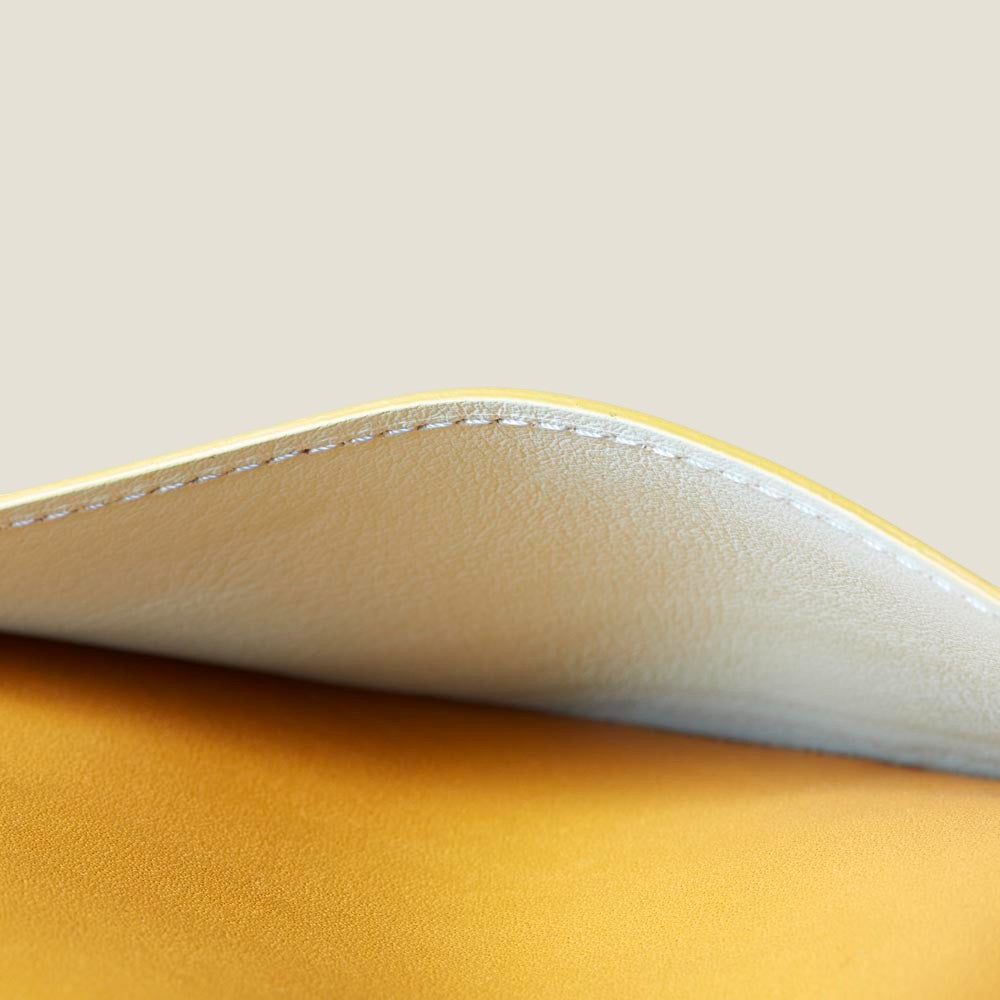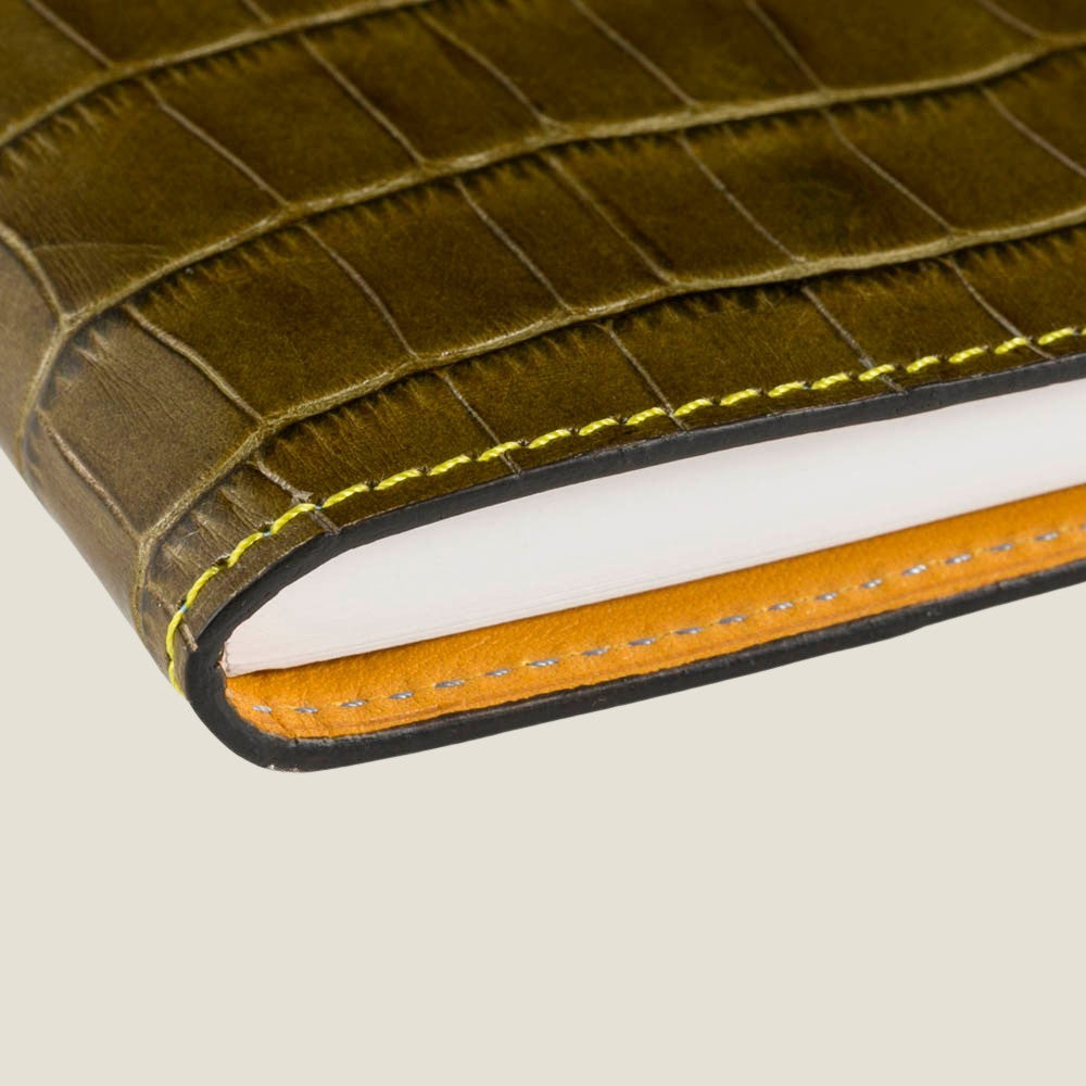 生後1年強のキップレザー(牛革)に、スモールクロコダイルの型押しを施したレザー。リアルクロコダイルに近い風合いを表現するため、ただ単に表から型を押すのではなく、表裏同時に別の型を押すことで、より凸凹の陰影が表れています。さらに、染色時もセミアニリン(染料と顔料をうまく調合する)仕上げを施すことで、透明感のあるカラーとなり、光の反射で凸凹の濃淡が美しく見えるのです。