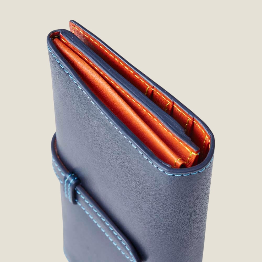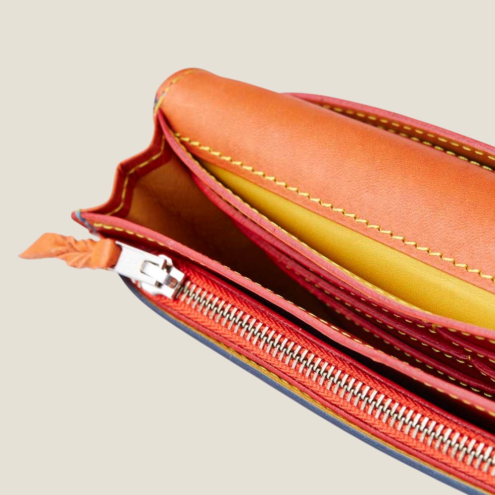札入れ部分のカード段は、財布を開けた際、全てのカードが周りの人に見えにくい配置にしているため、免許証や保険証など、プライベートなカードを忍ばせておくのに最適です。 カード段裏も収納ポケットにすることで、紙幣を種類別に分けたり、カード明細や、チケット類などを整理できる仕様に。 少し長めに作られたベルトも、中にモノがたくさん入った時、ベルトが外れずしっかり中身をケアするためのデザイン。