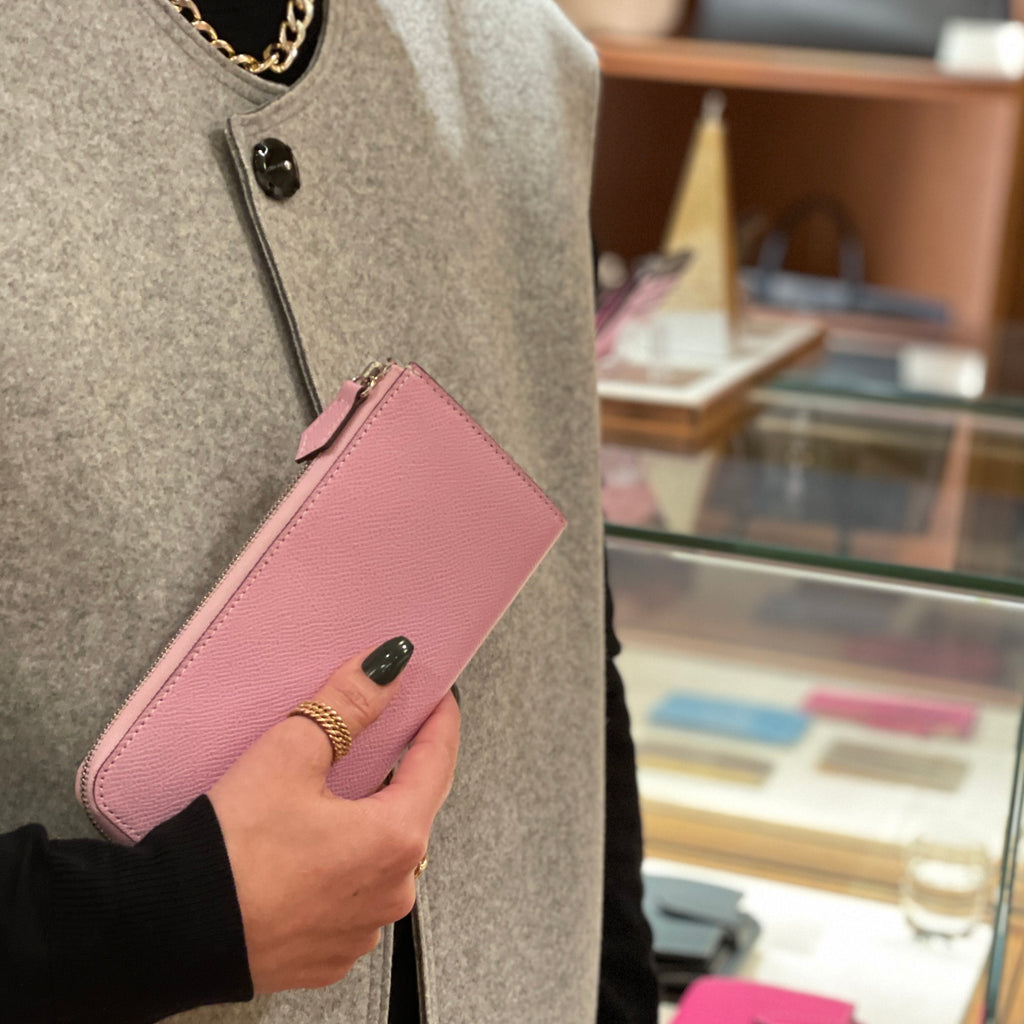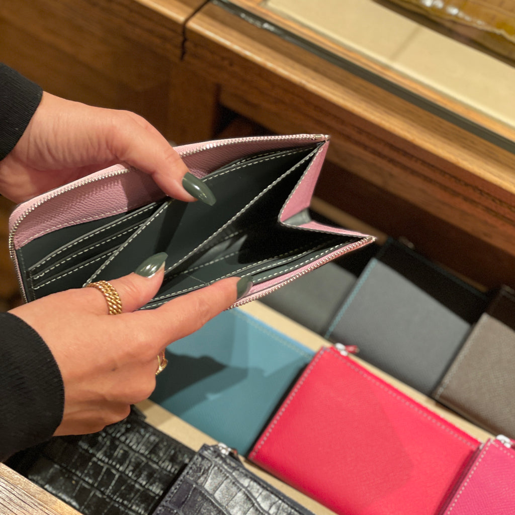 ジップタイプにも関わらず、ジャケットの内ポケットに入れても響かずスマートな印象。「厚みやサイズでジップタイプを懸念されていた方」「収納力は欲しいがスマートに持ちたい方」にマッチしています。表のフレンチカーフと、内側のオリジナルソフトレザーとのカラーコントラストが美しく、財布を使うことの喜びを与えてくれるアイテムへ仕上げています。