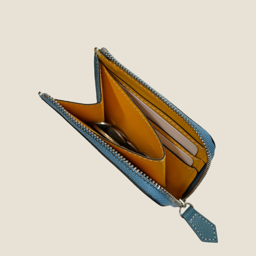 マチが大きいので、コインの出し入れがスムーズです。カードスリットはあえて2段にすることで、他のカード収納量を最大限に高めました。メインカードをスリットへ収納し、サブカードはサイドのコンパートメントへまとめてイン。プラスチックカードであれば約10枚程度入れることが可能です。紙幣はコインポケットに添わせるように入れ、スペースをフルに活用。全てを満たす定番スタイルが完成しました。