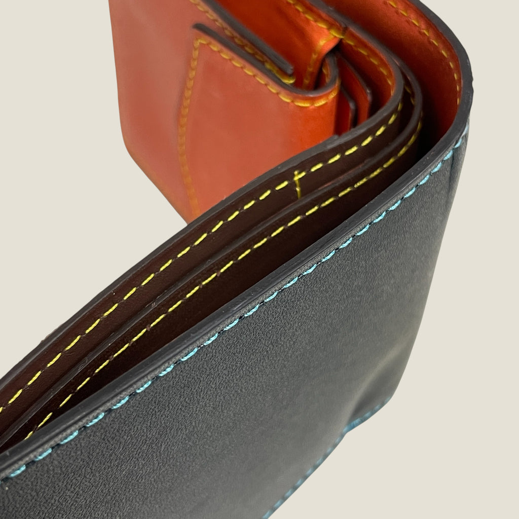 ⼀般的なお財布の⼩銭ポケットは、右側縦に付いているものが多いですが、ブルックリンでは右利きの⽅が使いやすい様、ポケットを左側に。より⼩銭の出し⼊れがスムーズに⾏えるようデザインしています。使い⼼地に徹底的にこだわることで⽀払いの所作を美しくする、ブルックリンミュージアムの⼆つ折り財布です。