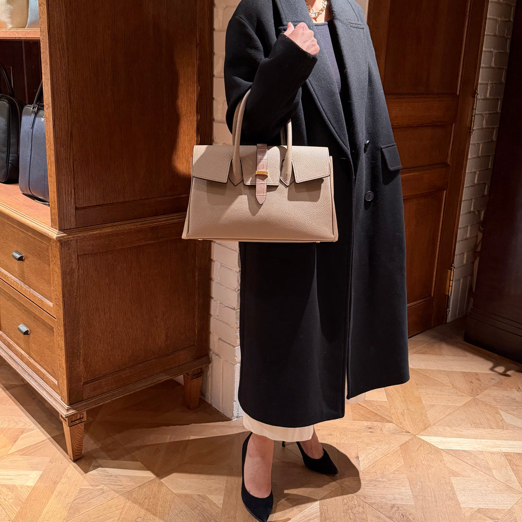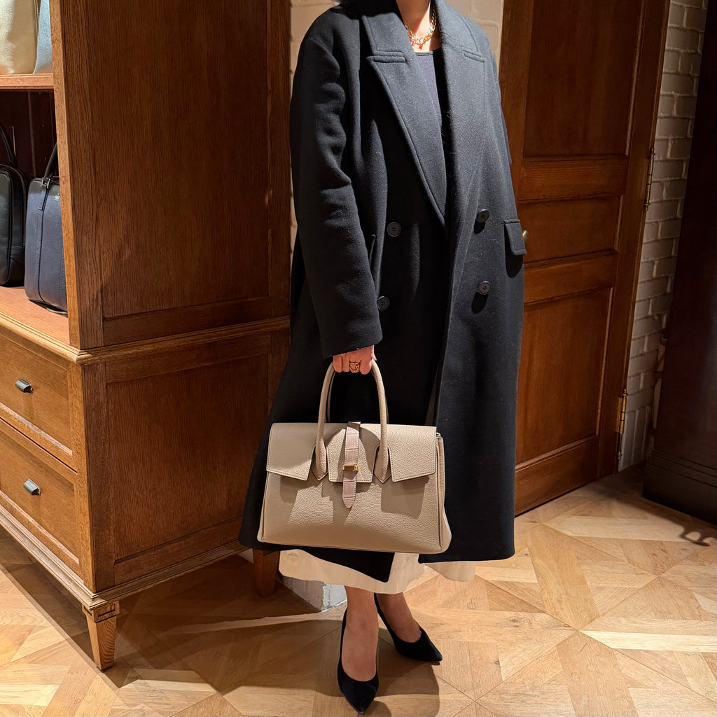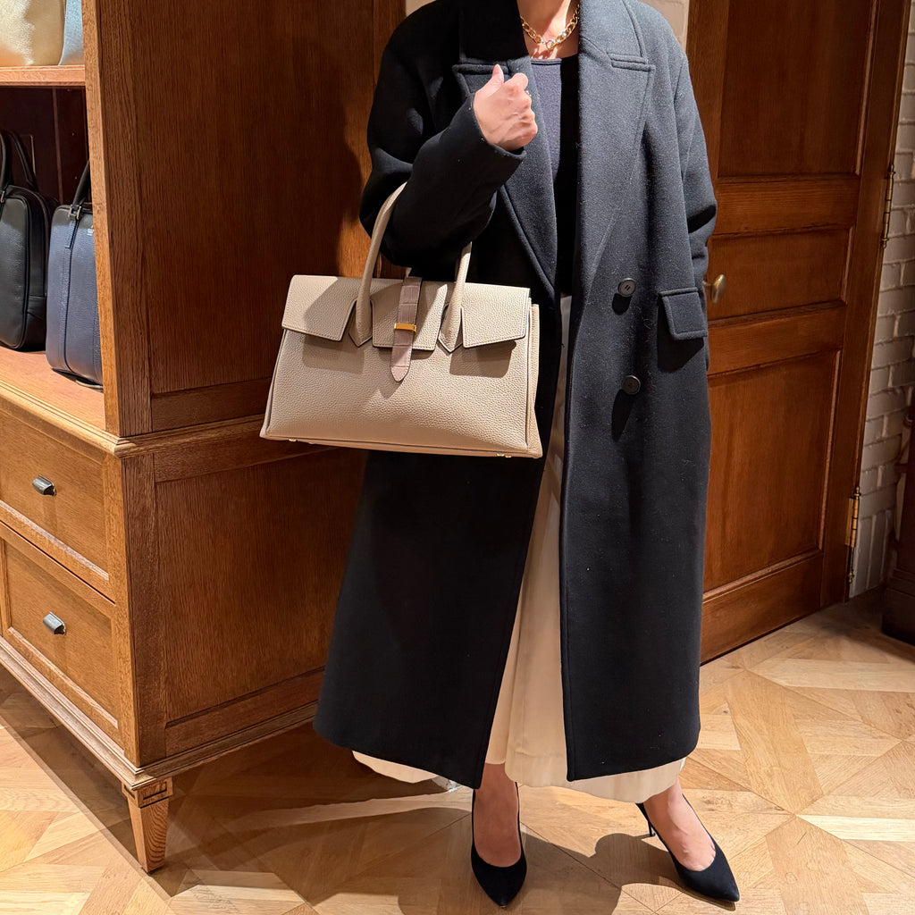パソコンが入りつつも、アフターワークのディナータイムなどに、“ いかにもビジネスバッグ ” に映らないよう、“ 品あるサイズ感 ” に仕上げ、持つ人のスタイルを美しく魅せるよう、横に広がりすぎないサイズバランスにも配慮いたしました。