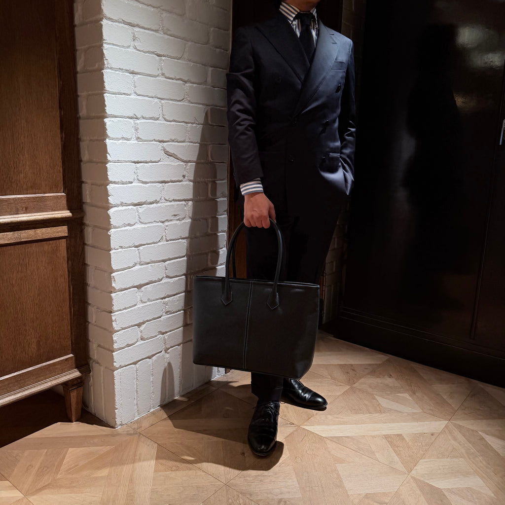 トートバッグを合わせにくいと思われがちな、タイドアップシーンにもグッとエレガントに決まってしまうのが、このバッグのポイント。