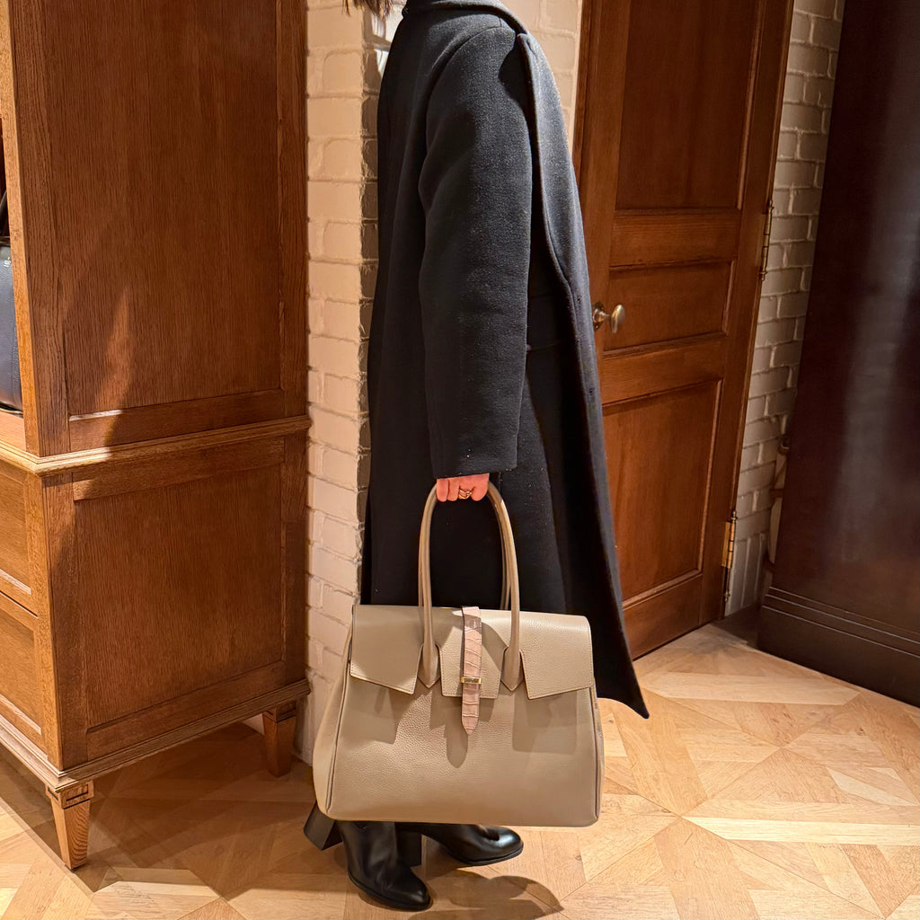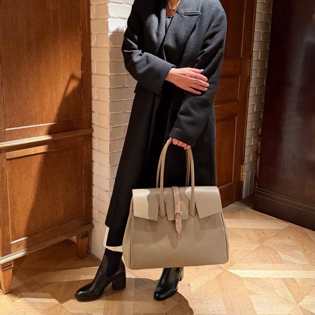 パソコンが入りつつも、アフターワークのディナータイムなどに、“ いかにもビジネスバッグ ” に映らないよう、“ 品あるサイズ感 ” に仕上げ、持つ人のスタイルを美しく魅せるよう、横に広がりすぎないサイズバランスにも配慮いたしました。
