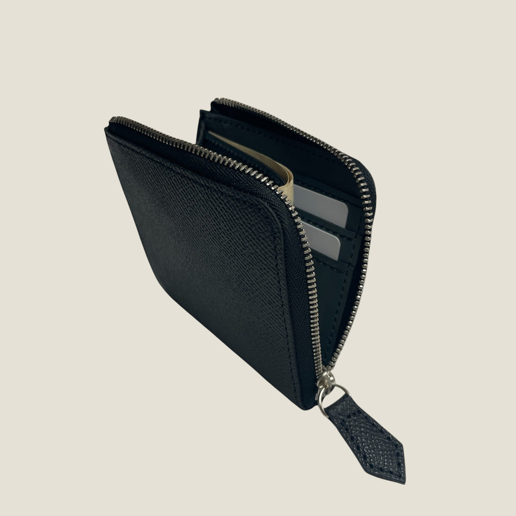 マチが大きいので、コインの出し入れがスムーズです。カードスリットはあえて2段にすることで、他のカード収納量を最大限に高めました。メインカードをスリットへ収納し、サブカードはサイドのコンパートメントへまとめてイン。プラスチックカードであれば約10枚程度入れることが可能です。紙幣はコインポケットに添わせるように入れ、スペースをフルに活用。全てを満たす定番スタイルが完成しました。