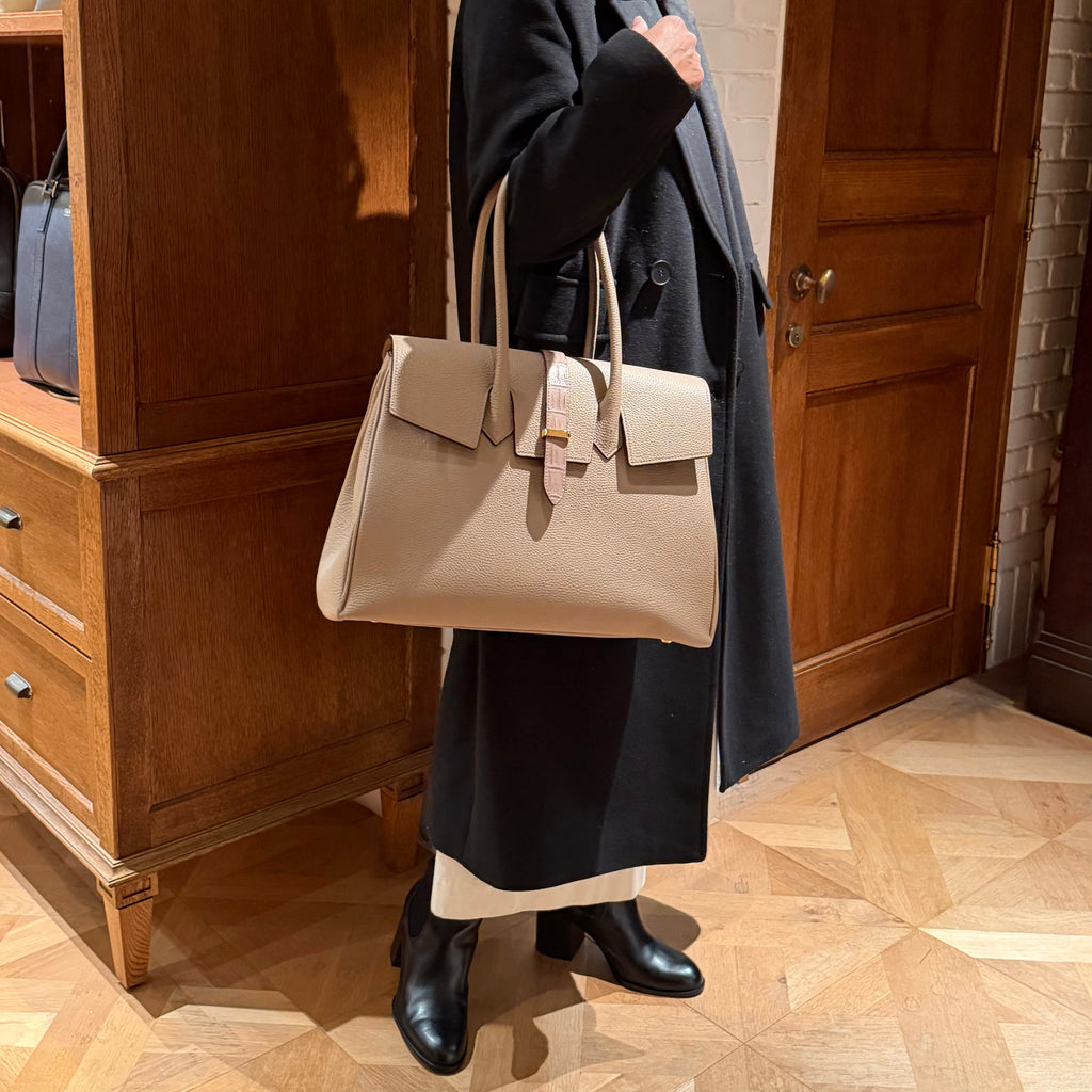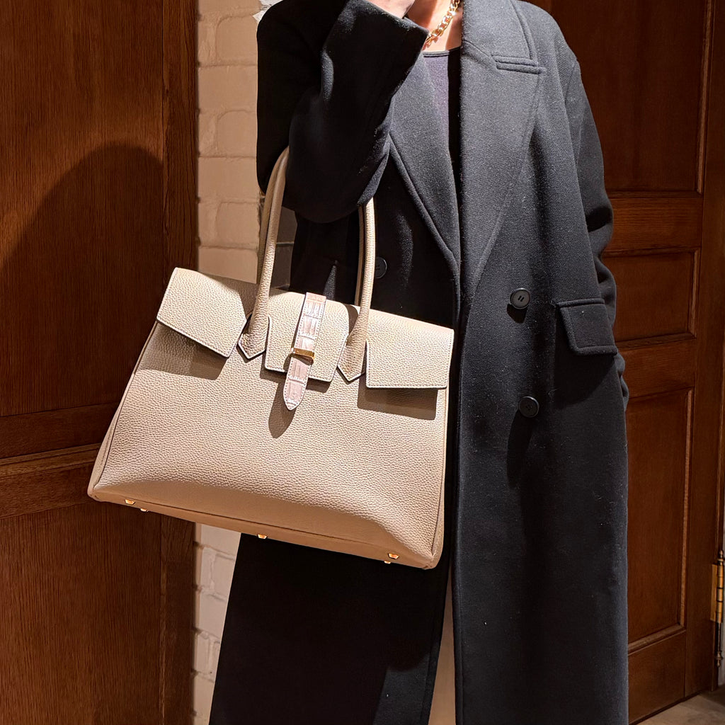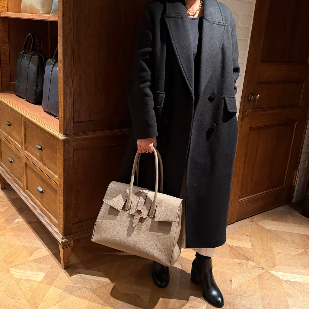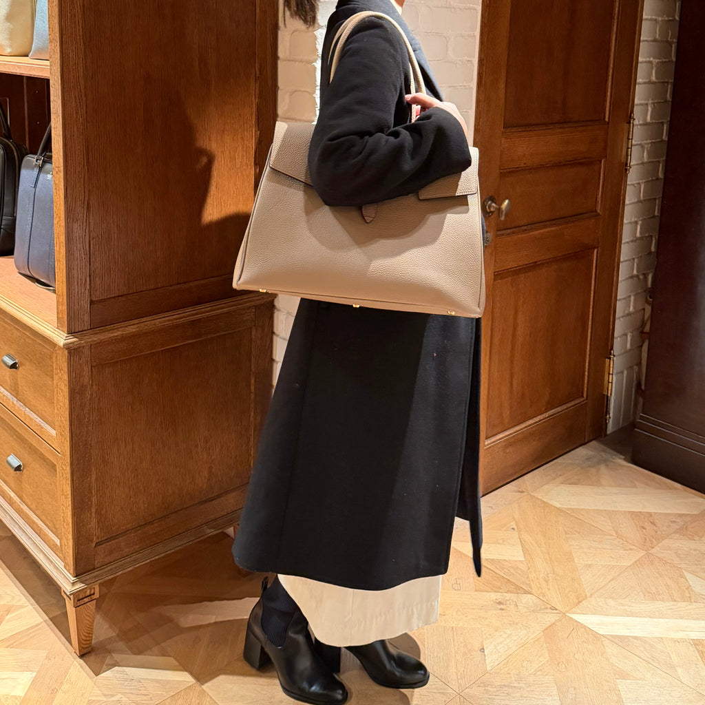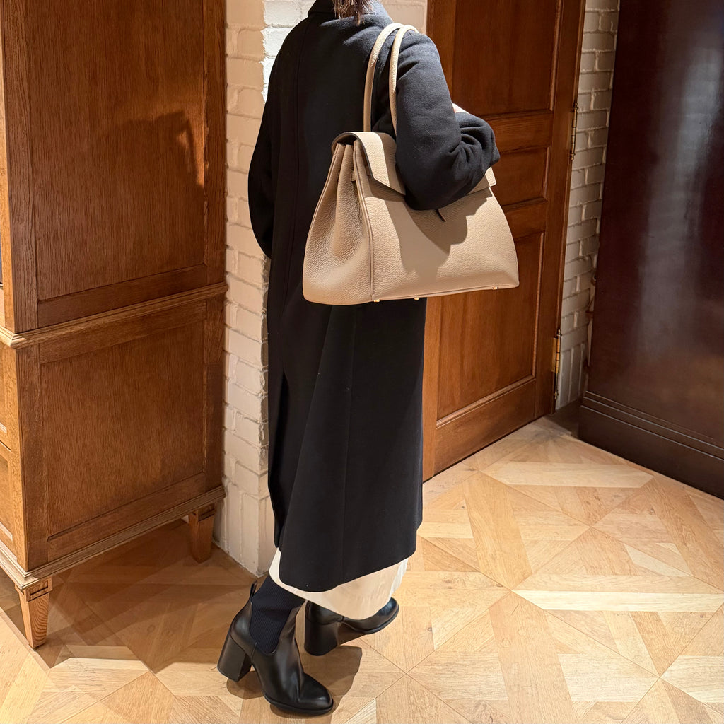 パソコンが入りつつも、アフターワークのディナータイムなどに、“ いかにもビジネスバッグ ” に映らないよう、“ 品あるサイズ感 ” に仕上げ、持つ人のスタイルを美しく魅せるよう、横に広がりすぎないサイズバランスにも配慮いたしました。