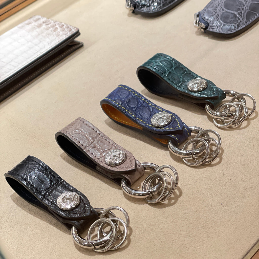極上のクロコダイル を使用したラグジュアリーなキーホルダーが誕生しました。ループの内側もレザー 仕立てのキーホルダーです。