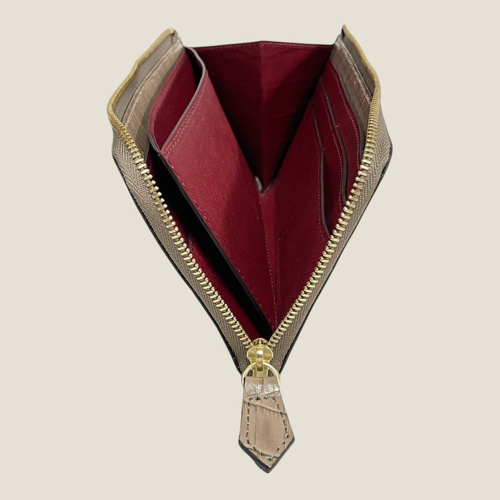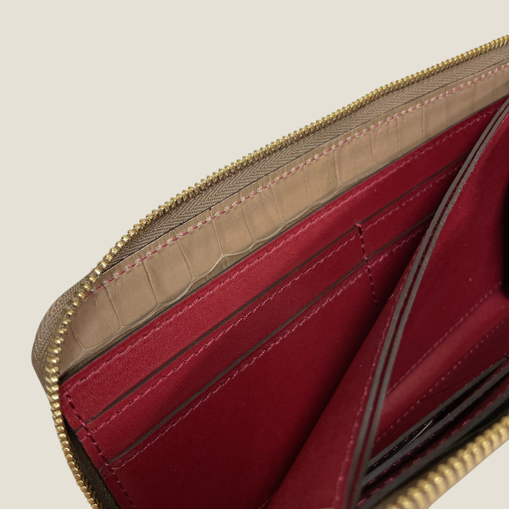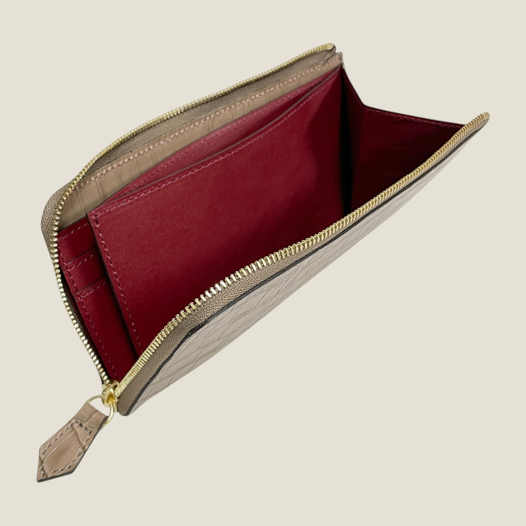 ジップタイプにも関わらず、ジャケットの内ポケットに入れても響かずスマートな印象。「厚みやサイズでジップタイプを懸念されていた方」「収納力は欲しいがスマートに持ちたい方」にマッチしています。表のクコロパターンと、内側のオリジナルソフトレザーとのカラーコントラストが美しく、財布を使うことの喜びを与えてくれるアイテムへ仕上げています。