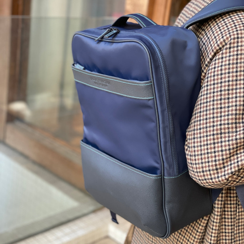 このバックパックの形状をスクエアにした理由は、シャープさや清潔感を表現することはもちろん、パソコンや書類・ビジネス書籍などの角が当たらず、さっと取り出す際のスマートさは抜群。マチ幅も12.5cmと、足元に置いた際の安定感が非常に高いため、外出先や商談時のどの場面を切り取ったとしても絵になるデザインを追い求めました。